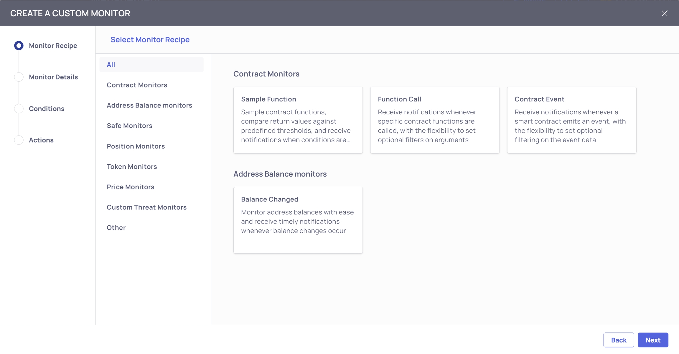 This type of monitor allows you to set specific monitoring criteria tailored to your needs and addresses. This customization includes parameters such as transaction types, addresses, and event severity, ensuring a personalized approach to safeguarding your activities.