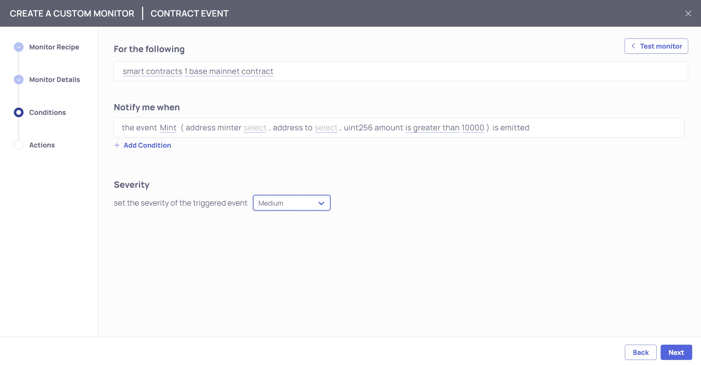 Add the contract address, define the events and rules you want to sample and monitor and set the severity for this monitor