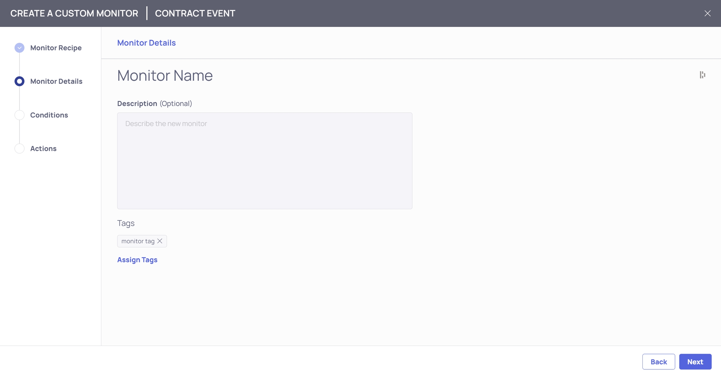 Choose 'Contract Event' monitor and select a name, you can also set a tag and description