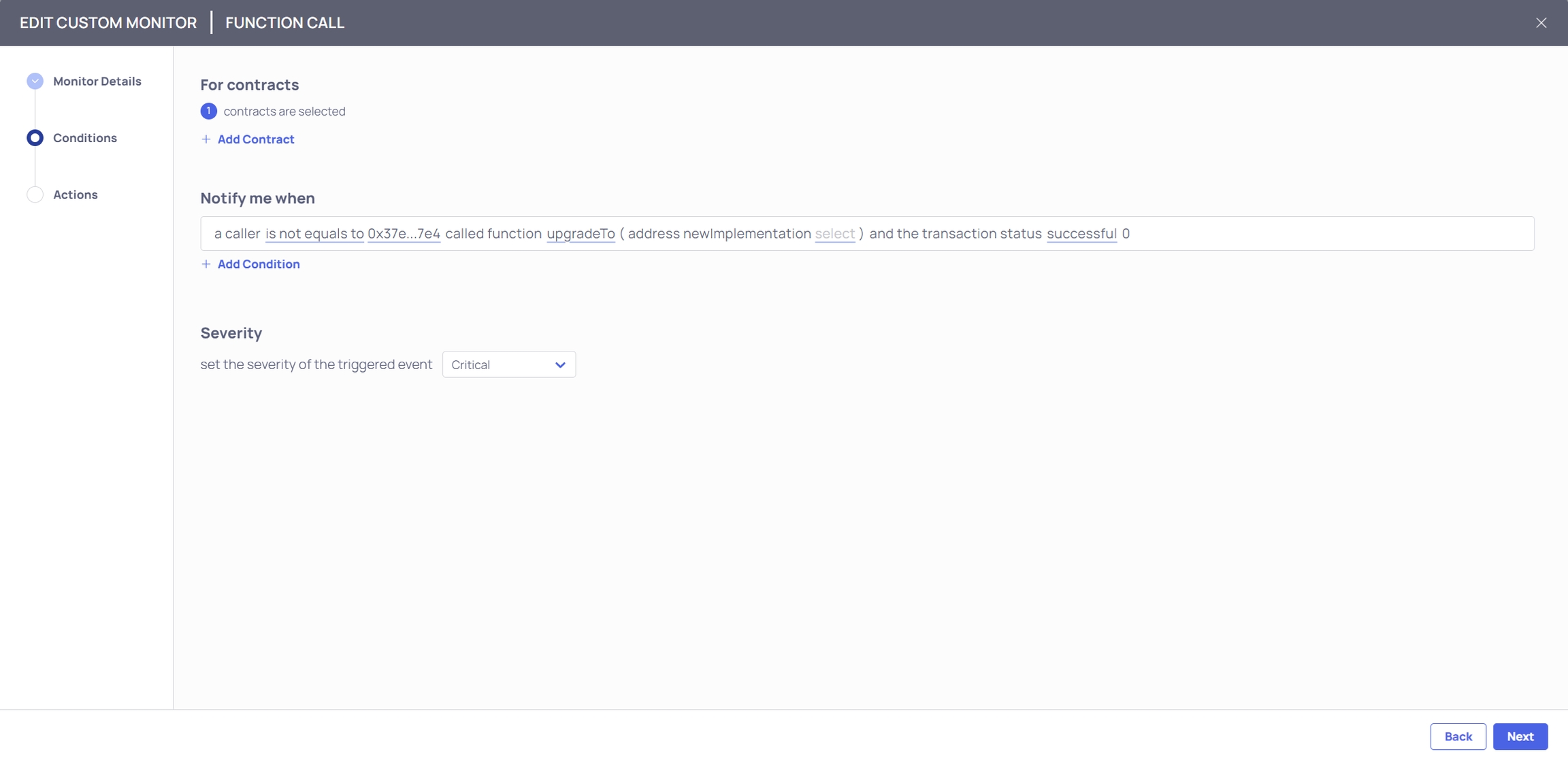 Add the contract address, define the functions and rules you want to sample and monitor and set the severity for this monitor