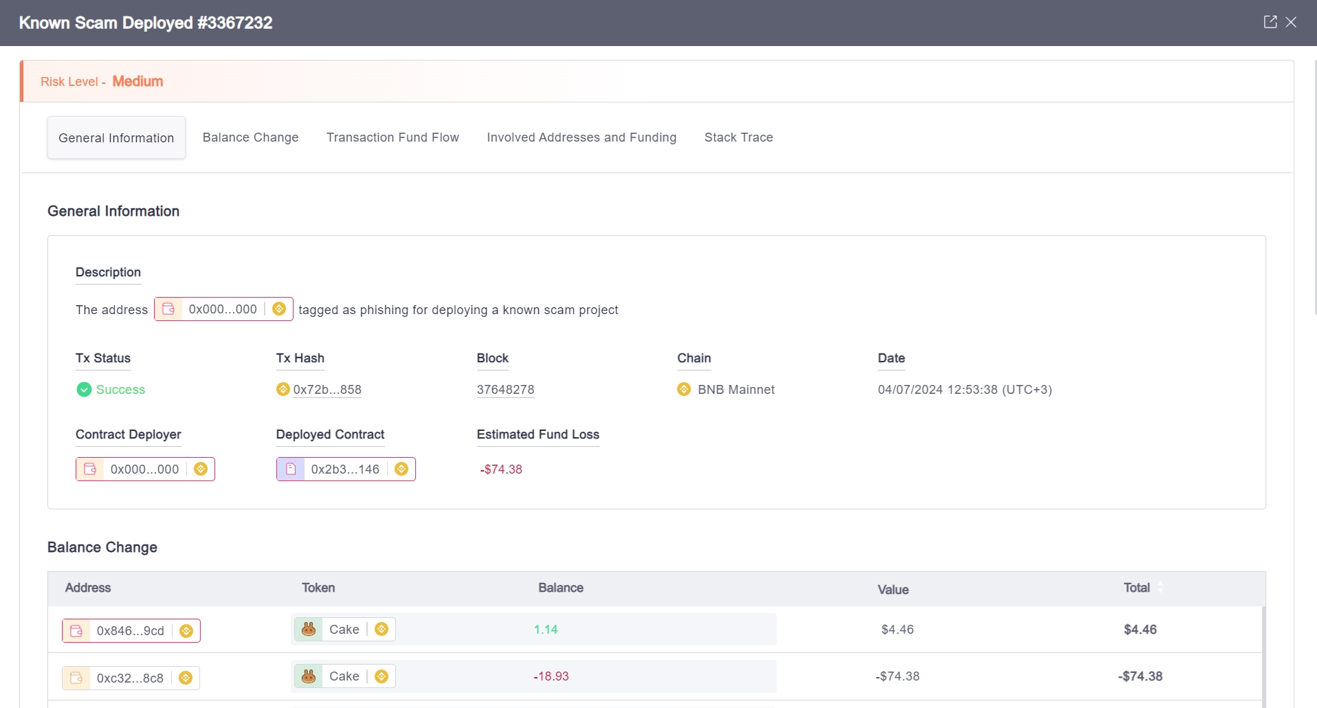 When a previously flagged scam smart contract has been deployed on-chain, an alert is triggered. Normally scam contracts are sold as kits so there are lots of variants of them being deployed everyday. We monitor for all of these activities so we know to track the deployer and the scam contract the second it goes on-chain.